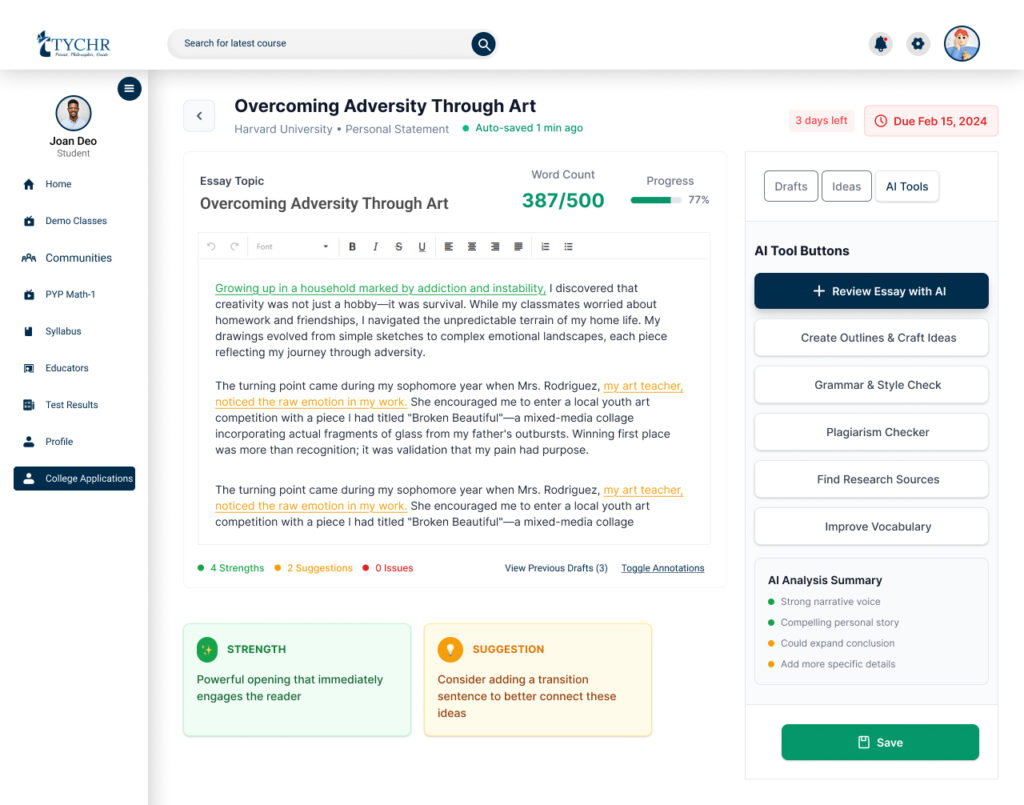 - Track the progression on multiple drafts, know what areas need additional development, and ensure their essays are original and polished.